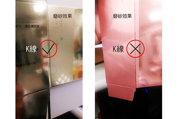 彩盒上常會有燙金、 燙銀、局部光或是局部磨砂的效果,讓彩盒包裝增加美感,一般的做法都會在彩盒平整面上使用,例如logo燙金、局部光,在做這樣大面積且橫跨到 有上局部光或是燙金效果時,因為折盒成型所產生的壓力,易造成K線(折線)的效果破裂或是脫落,所以在設計彩盒的時候 可以避開k線(折線)的地方,會讓彩盒後加工更加順暢。